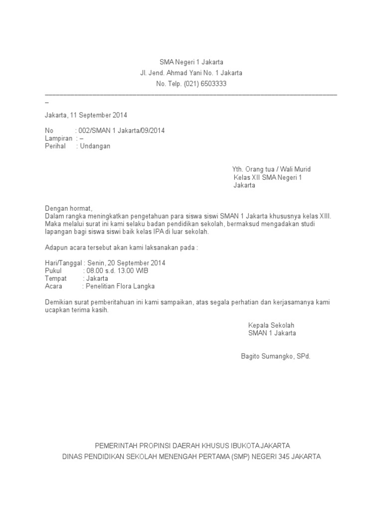 Contoh Surat Undangan Resmi Dinas Kumpulan Contoh Surat Proposal Laporan from 1.bp.blogspot.com Beberapa contoh surat resmi yaitu surat resmi perusahaan, surat permohonan, surat pemberitahuan, sekolah dan lain sebagainya. Dengan memberikan surat ini, sekolah menunjukkan dukungannya terhadap prestasi dan pencapaian yang diinginkan siswa. Pada umumnya, surat dinas dibuat oleh instansi atau lembaga baik pihak swasta maupun negeri yang bersifat resmi. Kepala sekolah sman 2 jakarta. Contoh surat pindah sekolah akan aku bahas di sini secara singkat dan detail. Sekolah sebagai salah satu bagian dari instansi pendidikan sering menggunakan surat sebagai media untuk berkomunikasi antar civitas akademika. Surat dinas resmi sekolah ini sebenarnya tidak jauh berbeda dengan surat pemberitahuan resmi yang telah kita bahas sebelumnya. Ambal dinas pendidikan pemuda dan olahraga melalui satuan kerja uptd pendidikan ttk/sd dan pnf kecamatan blablabla, kabupaten bandung barat akan.